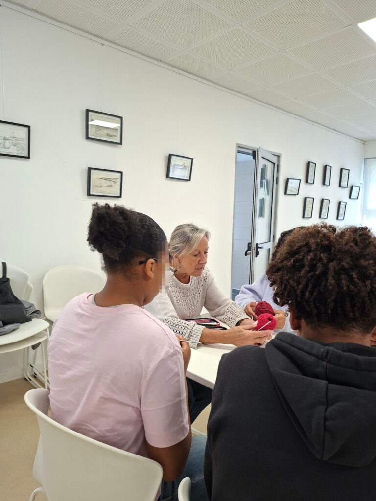 A atividade decorreu no Espaço Alfragide, durante a tarde, e foi dedicada à transmissão de técnicas de croché e/ou costura. Ao longo da sessão, os participantes ensinaram os/as jovens a confecionar peças para bebés, como botinhas, gorros, entre outros artigos.